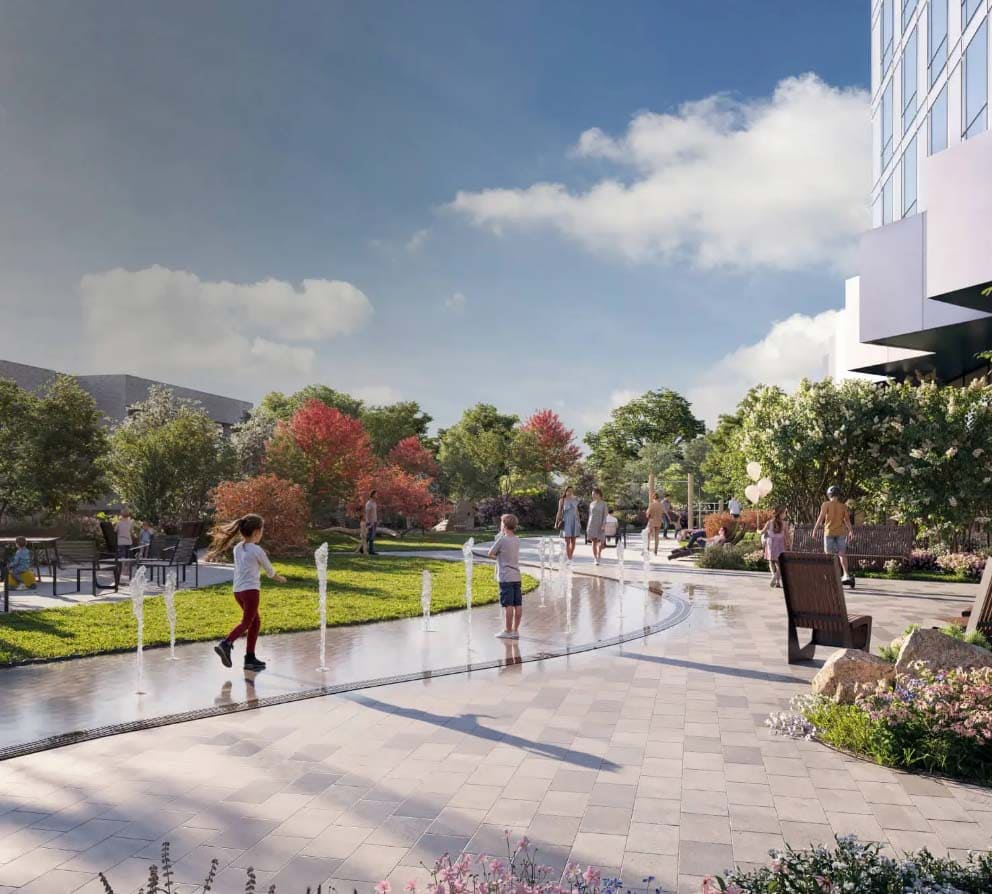 Приватные дворы организованы по принципу «двор без машин» и разделены на сценарные зоны: тихие пространства для отдыха, прогулочные маршруты, детские игровые площадки и спортивные элементы. Центральным акцентом первой очереди станет фонтан, интегрированный в ландшафтную композицию.
