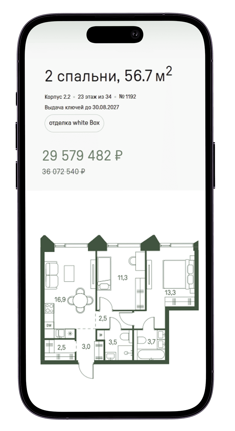 Первая очередь — 30-этажная башня на 330 квартир с отделкой White Box. Проект развивается в несколько очередей со сроками ввода до I квартала 2027 года.